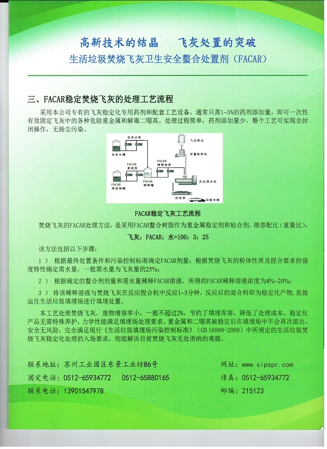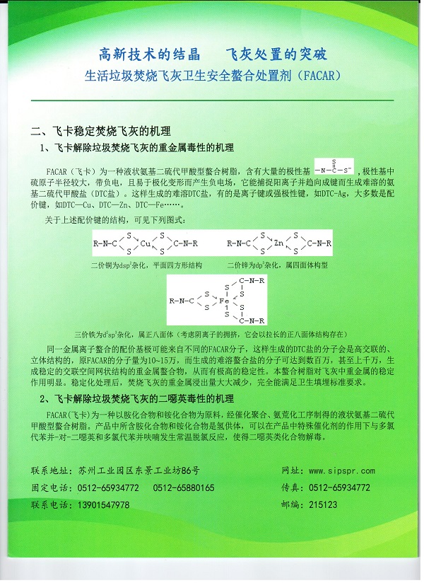 公司自創辦以來,已規模生產生活垃圾焚燒飛灰衛生安全螯合處置劑(FACAR,飛卡)、重金屬捕集沉淀劑(AOCAR,螯卡)和印染廢水專用混凝劑(TX)等產品,產品遠銷各地,廣泛應用于垃圾焚燒、電子、電鍍、印染等行業。